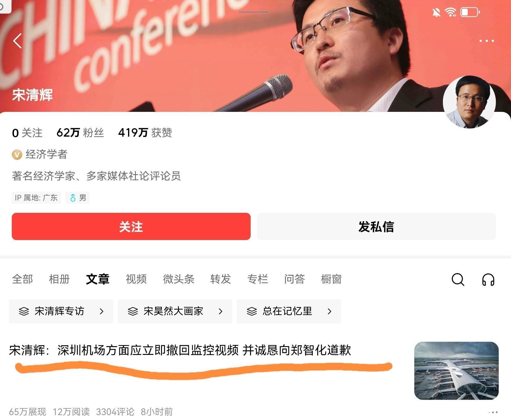 一场风波,机场的应对与一些不解的声音事情是这样的,郑智化跟深圳机场,好像有点事儿,具体啥事儿,大概就是有些争议。机场那边也回应了,道了歉,还说以后会更好,关键是,他们把监控视频都公开了,想说明白。然后吧,有个经济学家,叫宋清辉,他好像不太一样,人家觉得机场应该把视频撤了,再给郑智化道个歉,很多人都觉得,这不太对劲吧。